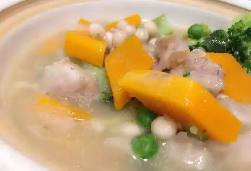 (8)湯熬制三小時後,放入紅棗、胡蘿蔔塊、圓白菜繼續熬制二小時,共五小時後便可食用了,最後調味加鹽、胡椒粉,鮮味劑就用不著了。湯鮮味美,營養全面,抗衰老強。香芋南瓜煲