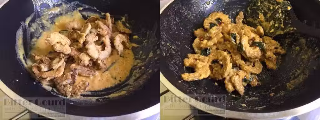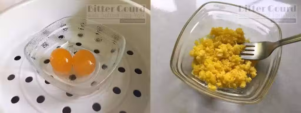 材料:苦瓜,牛油,小辣椒(切粒),蒜末,咖哩葉,雞蛋,玉米粉,鹹蛋黃,淡奶