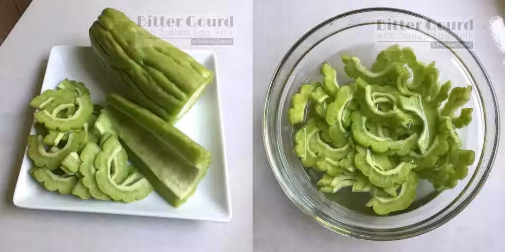 2. 苦瓜洗凈去籽,切片,浸入鹽水一會兒可減少苦味。