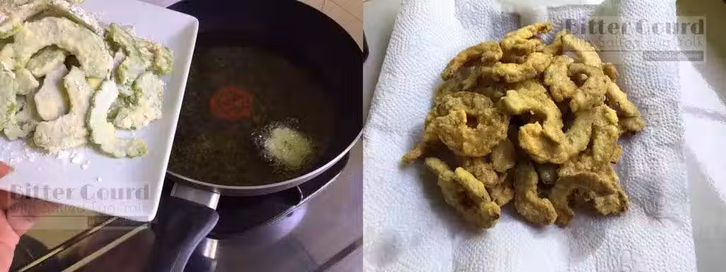 3. 將苦瓜片瀝干後,沾上蛋液和玉米粉。