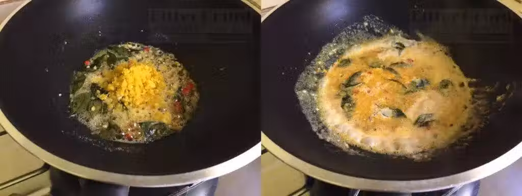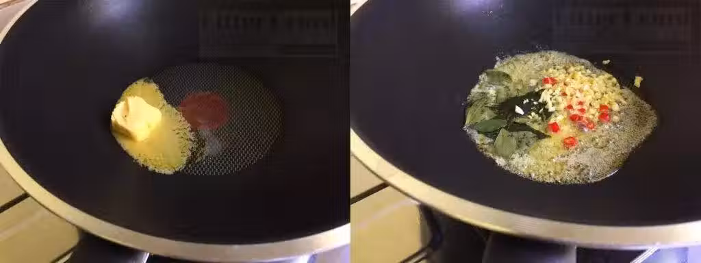 5. 將牛油加熱至融。放入蒜末,辣椒粒和咖哩葉爆香。