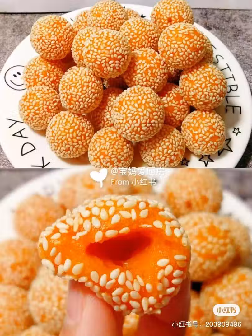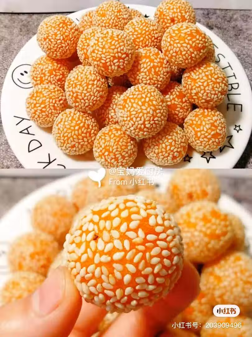 食材:南瓜300克,糯米粉300克,白糖25克,白芝麻適量,食用油適量
