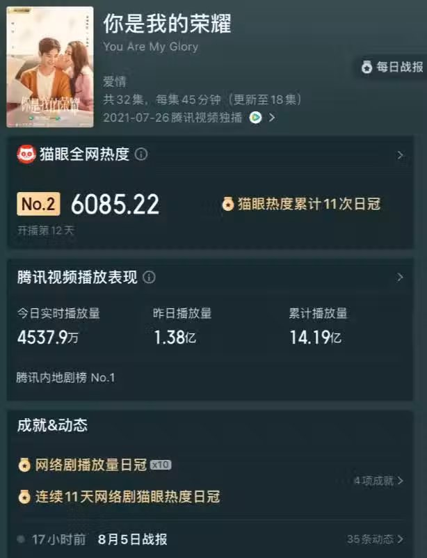 《你是我的榮耀》實在太火了,儘管不是更新日,它的播放依舊以億左右單位,路人口碑不斷轉化,是實至名歸的爆款。