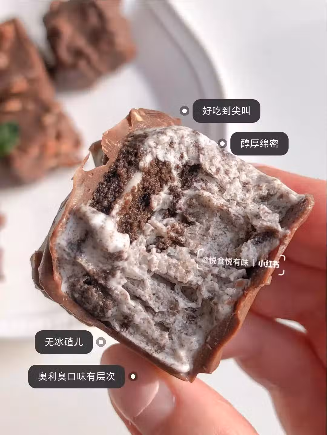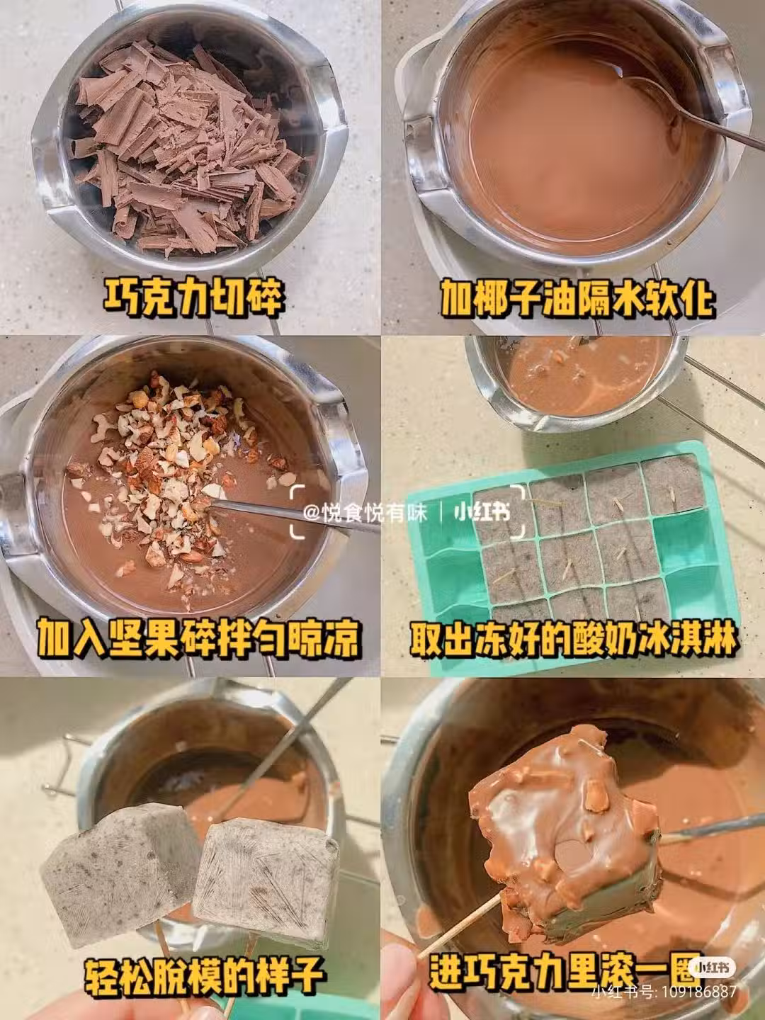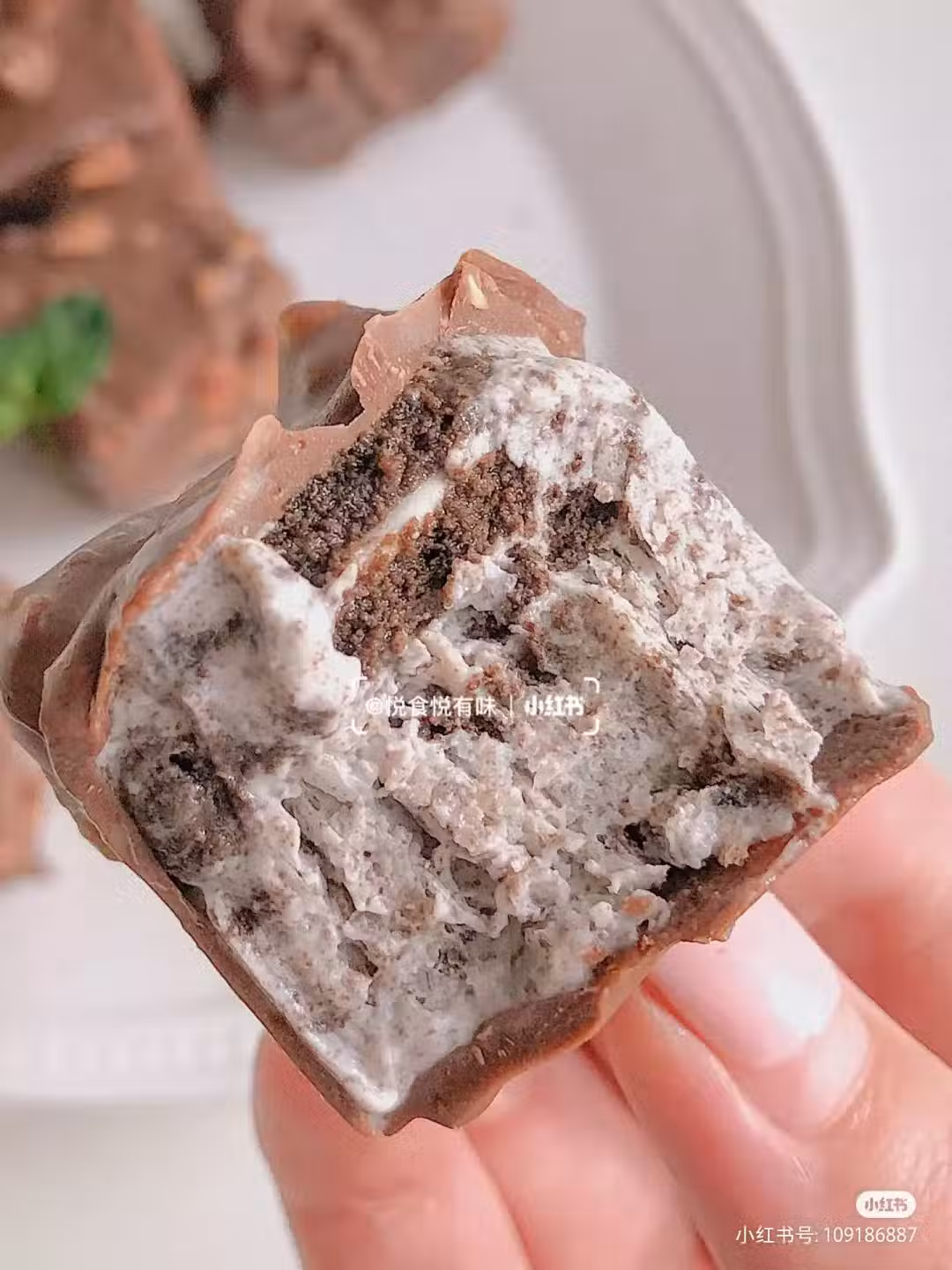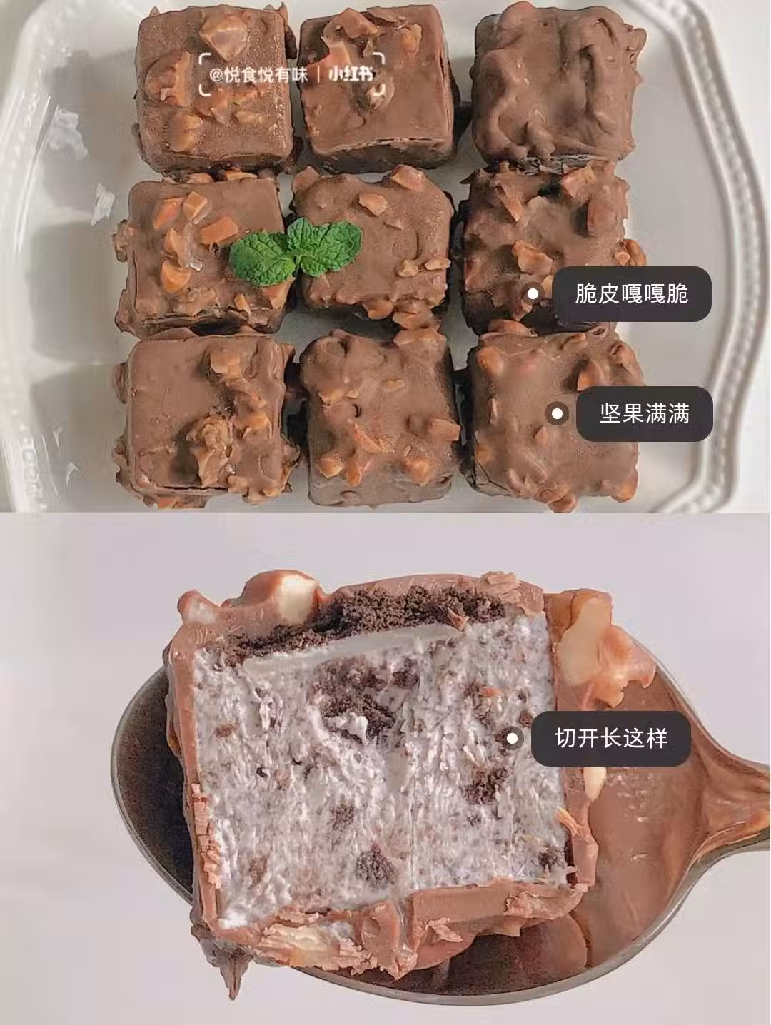 取出凍好的冰淇淋,脫模後在巧克力里蘸一圈即可形成脆皮