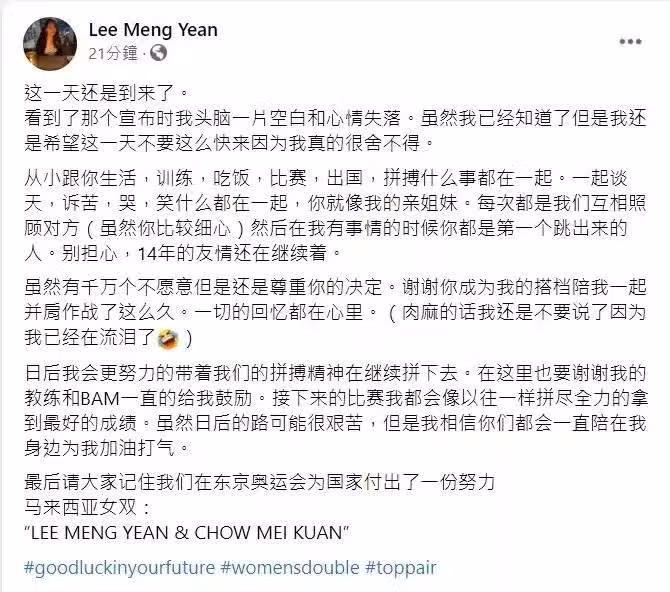 馬來西亞羽球總會在16日通過社交平台發文確實了大馬女雙好手鄒美君退出國家隊的消息,就在17日午夜鄒美君的拍檔李明晏,通過己的社交平台發文,表示對拍檔鄒美君的不舍。
