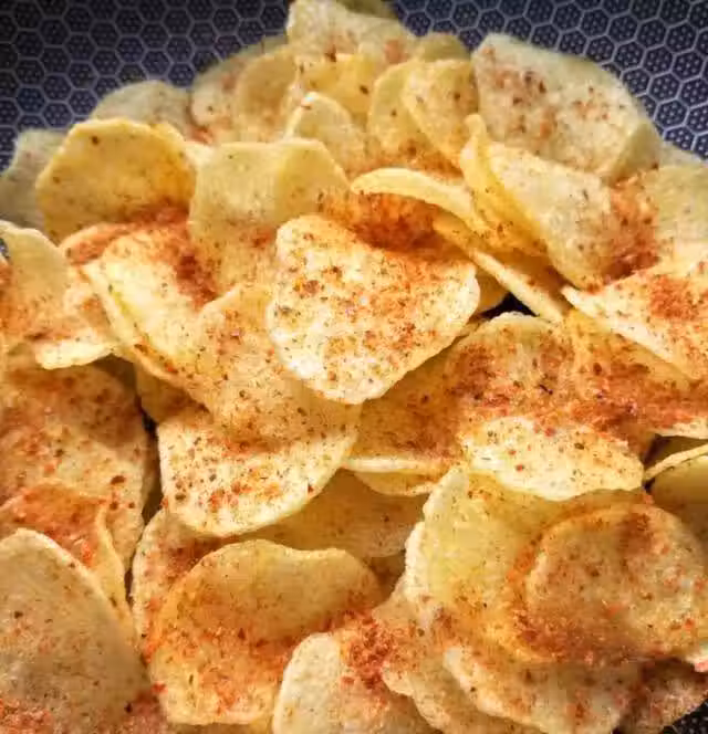 把炸好的薯片放到鍋中或者一個大碗里,加入調好的辣椒孜然面抖動一下,讓薯片都沾上辣椒麵就可以開吃了!