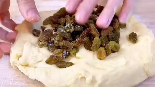 6.準備一點葡萄乾,放到麵糰上,一起揉搓排氣,揉到原來的大小,儘量排乾淨裡面的氣。
