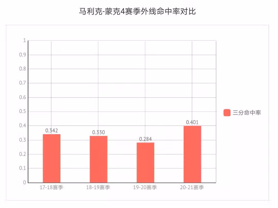 前兩個賽季,蒙克在黃蜂隊已經能貢獻出場均得分上雙的表現,不再只有年輕和潛力才是他的賣點。並且,蒙克在今年完成了一項出色的蛻變,那就是在外線的投射效率上。19-20賽季,蒙克的三分球命中率僅僅只有28.4%,場均出手3.7次命中1.1球,而上個賽季蒙克的三分球命中率卻一舉突破4成,達到了40.1%,命中率提高的同時還增加了產量,場均出手5次命中2球。要知道,湖人是一支外線投射能力偏弱的球隊,上個賽季他們特意為此引進了麥克勒摩,卻沒能起到很好的效果。