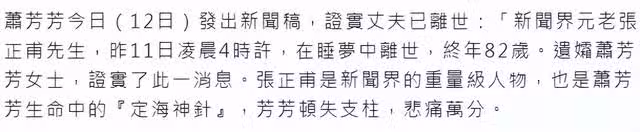 隨後,蕭芳芳通過媒體發出新聞稿,證實了丈夫離世的消息,並沉痛地表示,丈夫是她生命中的「定海神針」,突然去世令她感覺頓失支柱,悲痛萬分。