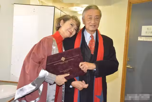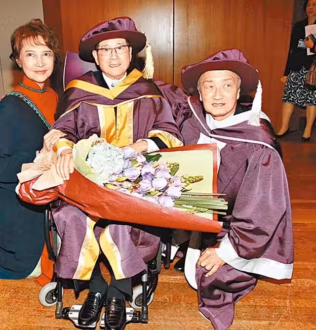 2015年,蕭芳芳獲得香港理工大學院士學位,張正甫還貼心陪同,夫妻倆親密地摟在一起大秀恩愛。