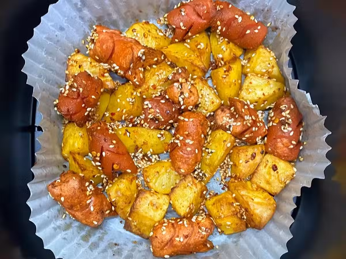 準備幾個土豆,刮掉外皮,清洗乾淨,改刀切成滾刀塊,再準備幾根火腿腸,剝掉外衣,切成長段,打上花刀,加入辣椒油、孜然粉和白芝麻,翻拌均勻,先把土豆放入空氣炸鍋中,調至180度,烤上20分鐘,再放入火腿腸,繼續再烤8分鐘,鮮香美味,搭配番茄醬一起,味道非常的哇塞。