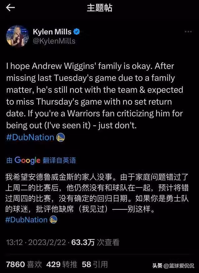 一名體育記者在自己的個人社媒上發布了這樣一段話,翻譯過來內容是講希望維金斯的家人沒事,也請勇士球迷予以理解。