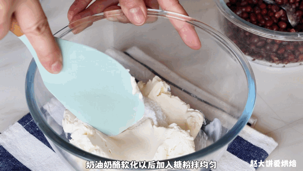軟化的奶油奶酪加入糖粉,拌均勻即可。蜜豆的做法,可以看回我前幾天發的青團文章,也可以購買現成的蜜豆。