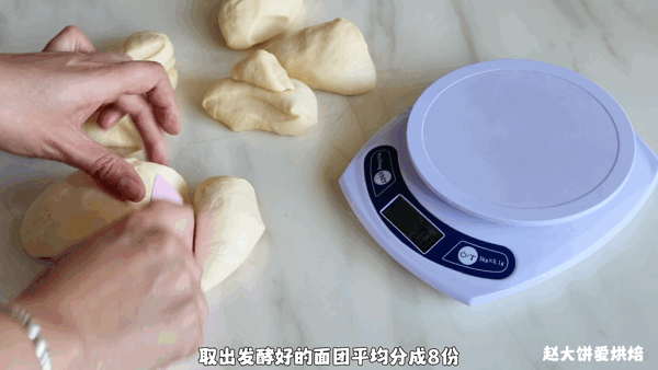 4,取出發酵好的面團,分割成8份,大概是60克/個
