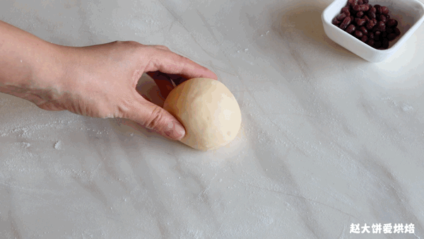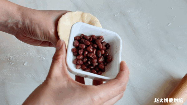 翻面,包入20克的蜜豆,收口收緊
