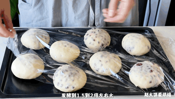 8,發酵好的面團,蓋上一張油布,再壓上一個烤盤,放入預熱好的烤箱,中層,上火200度,下火170度,烘烤15分鐘(溫度和時間,僅供參考)