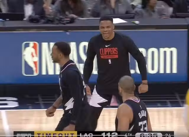 因為就在詹姆斯去巡視對手板凳席之前,是威少先去挑釁的。當時比賽第4節的時候,時間還剩下6分35秒,鮑威爾反擊把球給到了萊昂納德,小卡高高躍起空中接力,單手暴扣,把分差擴大到20分,快艇大比分領先。
