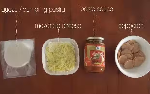 餃子皮;芝士碎、吞拿魚罐頭;甜椒;菠蘿;番茄醬;洋蔥等等