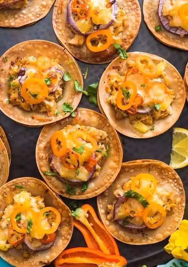 把餃子皮烤得脆脆的,加上各種各樣的食材,吃起來口感豐富,香脆可口。不喜歡吃吞拿魚的話,可以換成其他的或者不加也行。