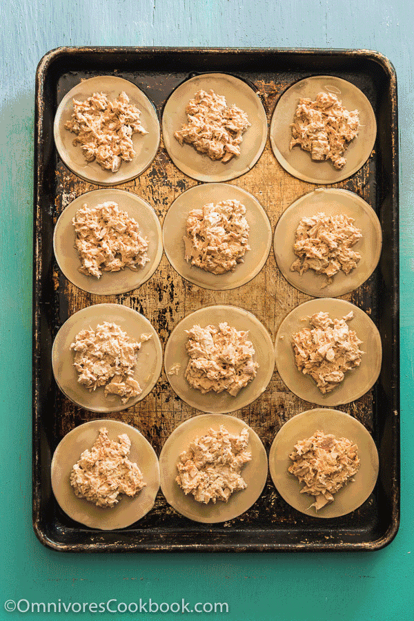 1 在烤盤上抹一層油,鋪上餃子皮。