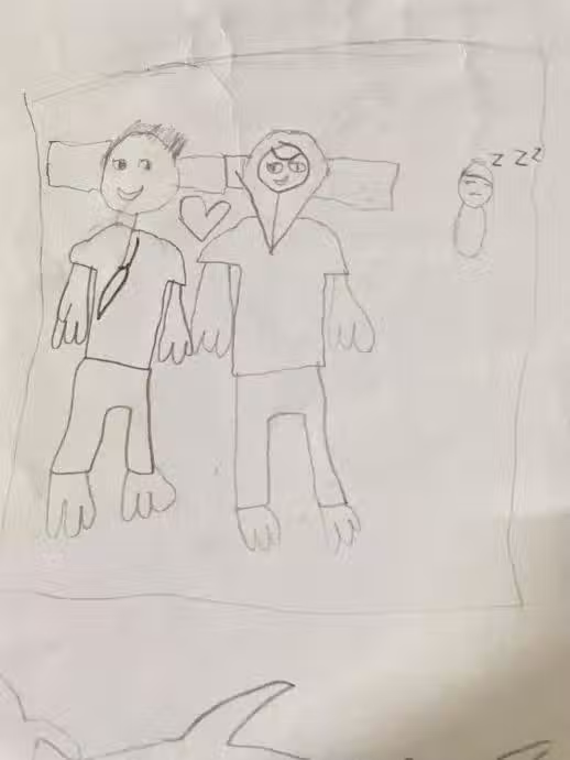 諾哈茲瓦尼憶起7歲的兒子阿依丹在去世幾天前曾向她展示一副畫作,畫中三人一起躺在床上,爸媽還未入睡,一旁的自己卻已熟睡。