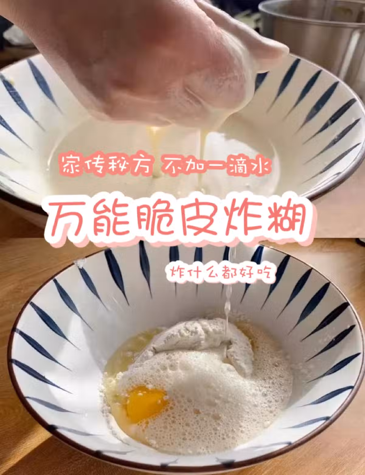 鹽可以增加口感,而泡打粉的加入,可以使食物更加的蓬鬆酥脆,所以泡打粉是不能少的。然後倒入10克的食用油,這食用油同樣是不能少的,因為加入食用油的炸糊做出來的食物,可以更加的起酥,而且還可以起到提亮的效果。