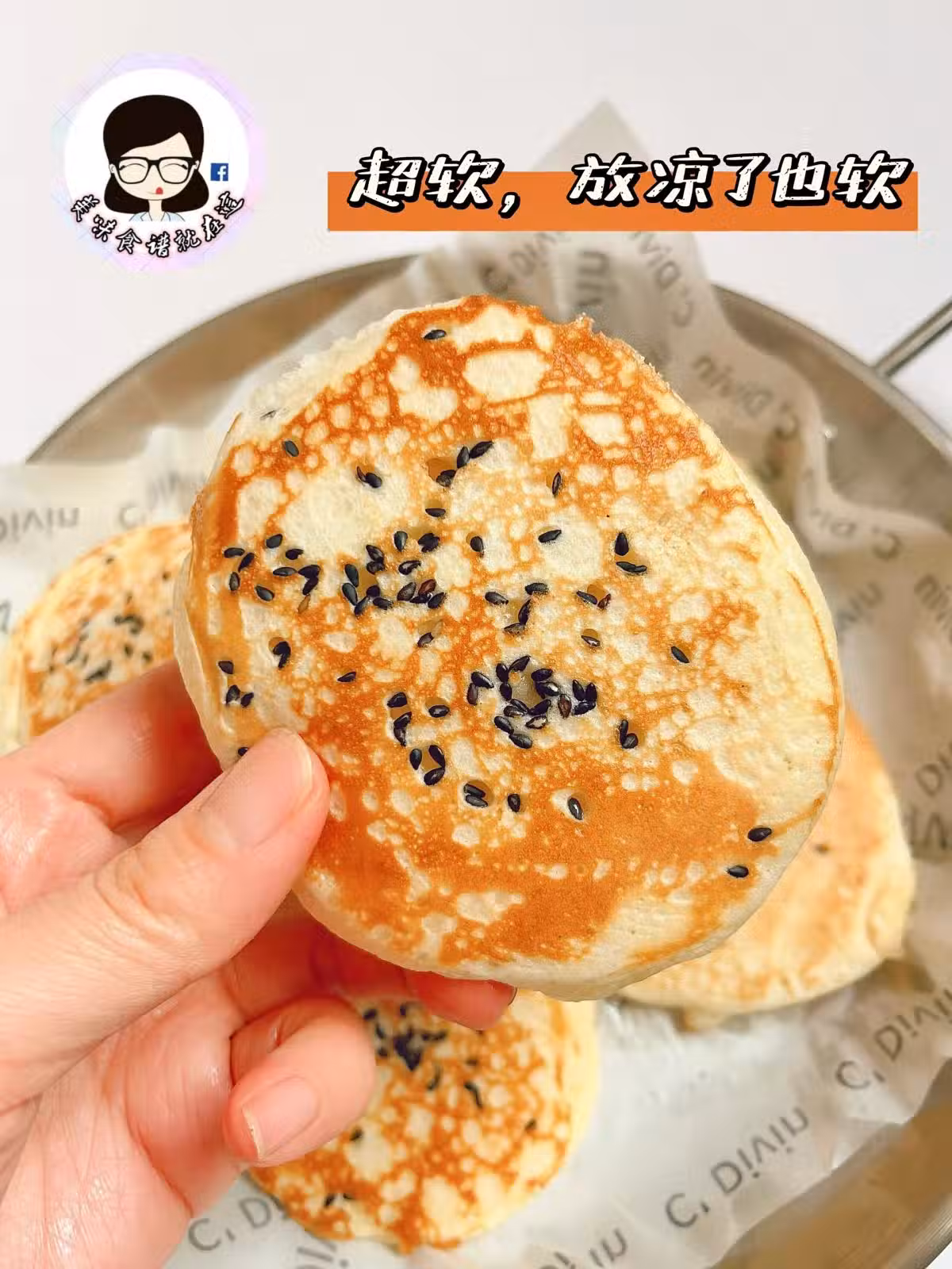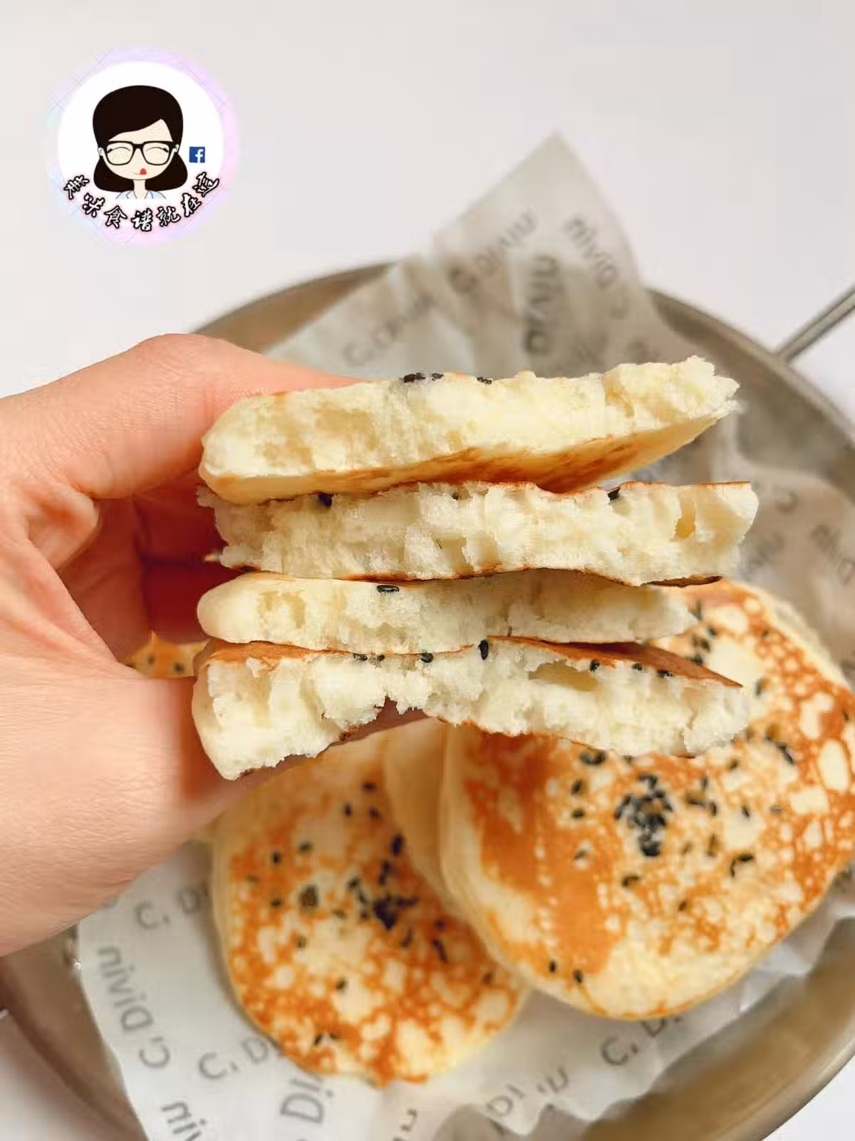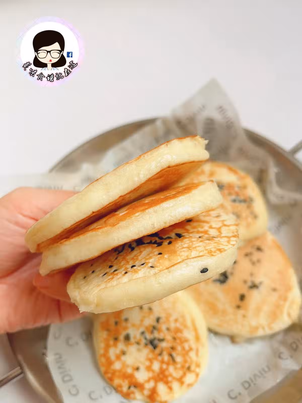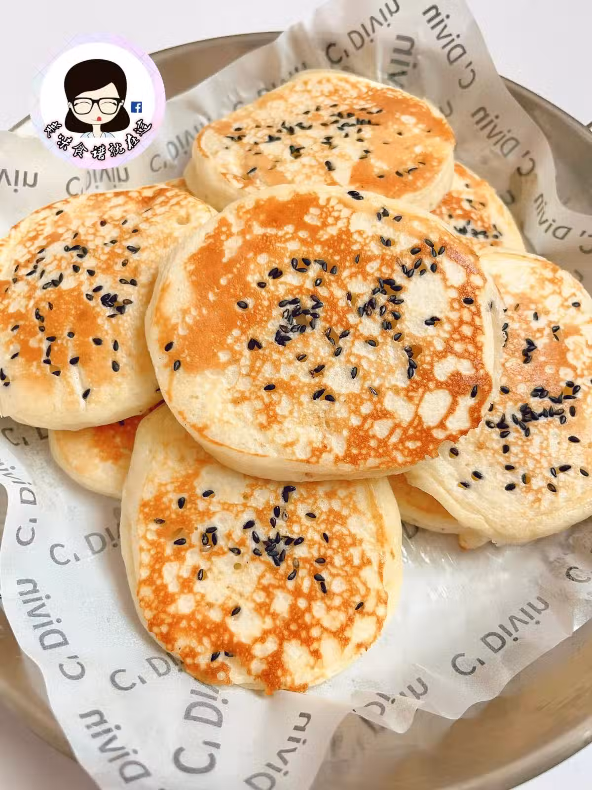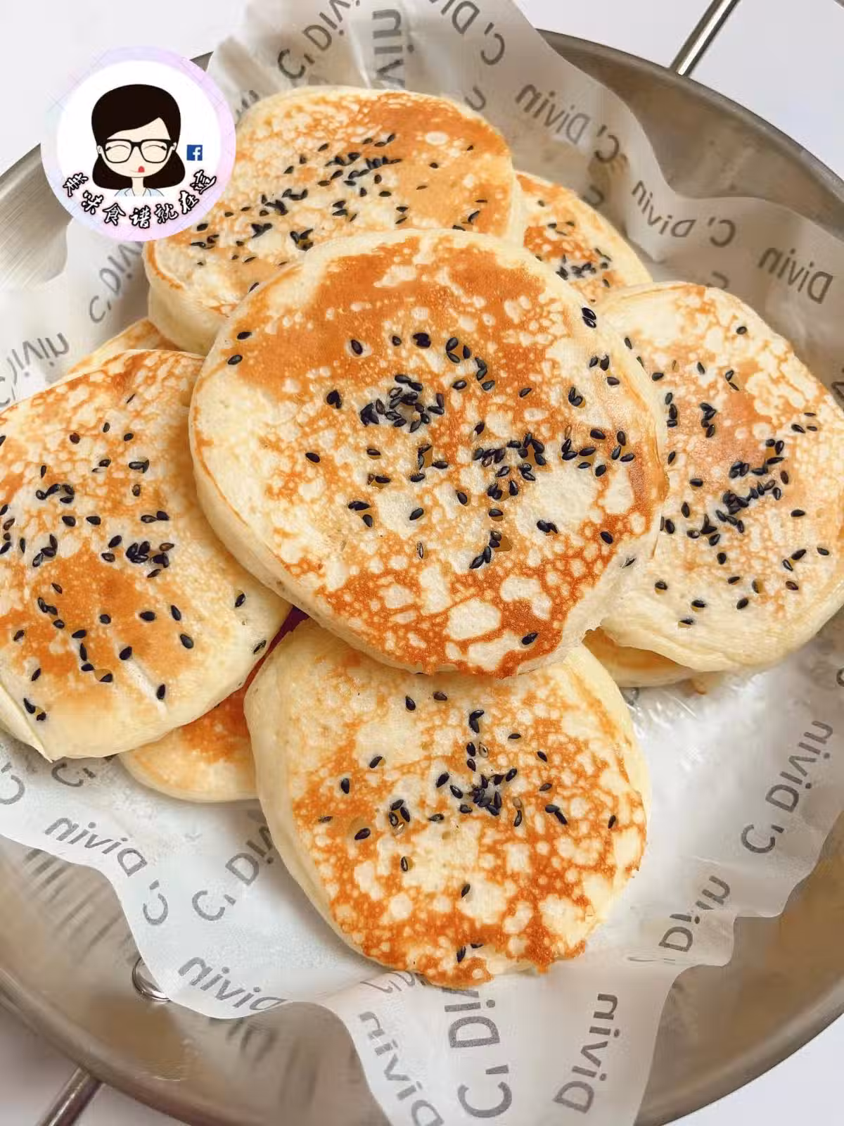 2⃣️平底鍋刷油,倒入麵糊,冰上有小氣孔的時候撒點黑芝麻在發麵煎一下就可以了