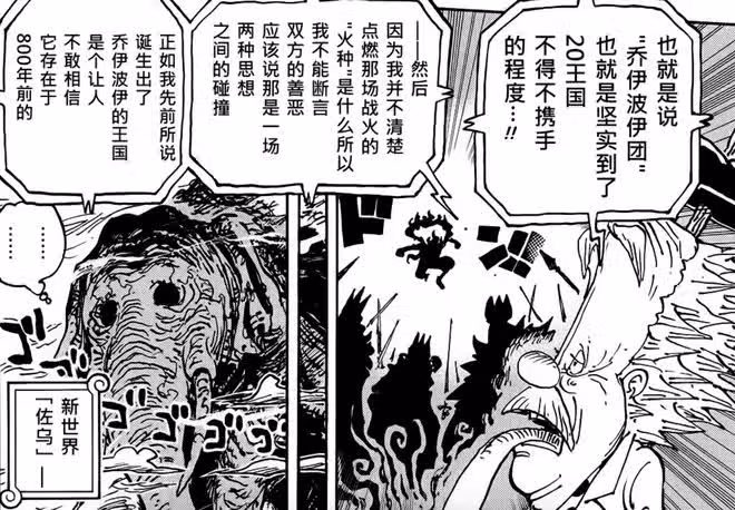 這一話提到了喬伊波伊與20個王國為敵的信息,尾田還很貼心的附上了化身太陽神尼卡形態的喬伊波伊與伊姆為首的20個國王對峙並準備激戰的黑影,而我個人也發現了這張圖所暗示的一些信息,大大增加了路飛並非普通之人,而是喬伊波伊的後世之人(轉世者)。