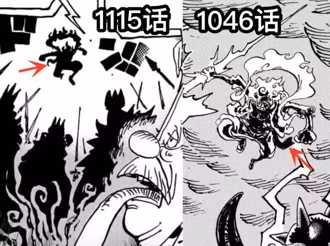 腰帶。這就有點意思了哈!小蜘蛛特意選取了1046話身處在半空中的尼卡路飛,對比一下1115話出現的喬伊波伊尼卡形態黑影,幾乎是一模一樣的,而且體型也沒那麼誇張。