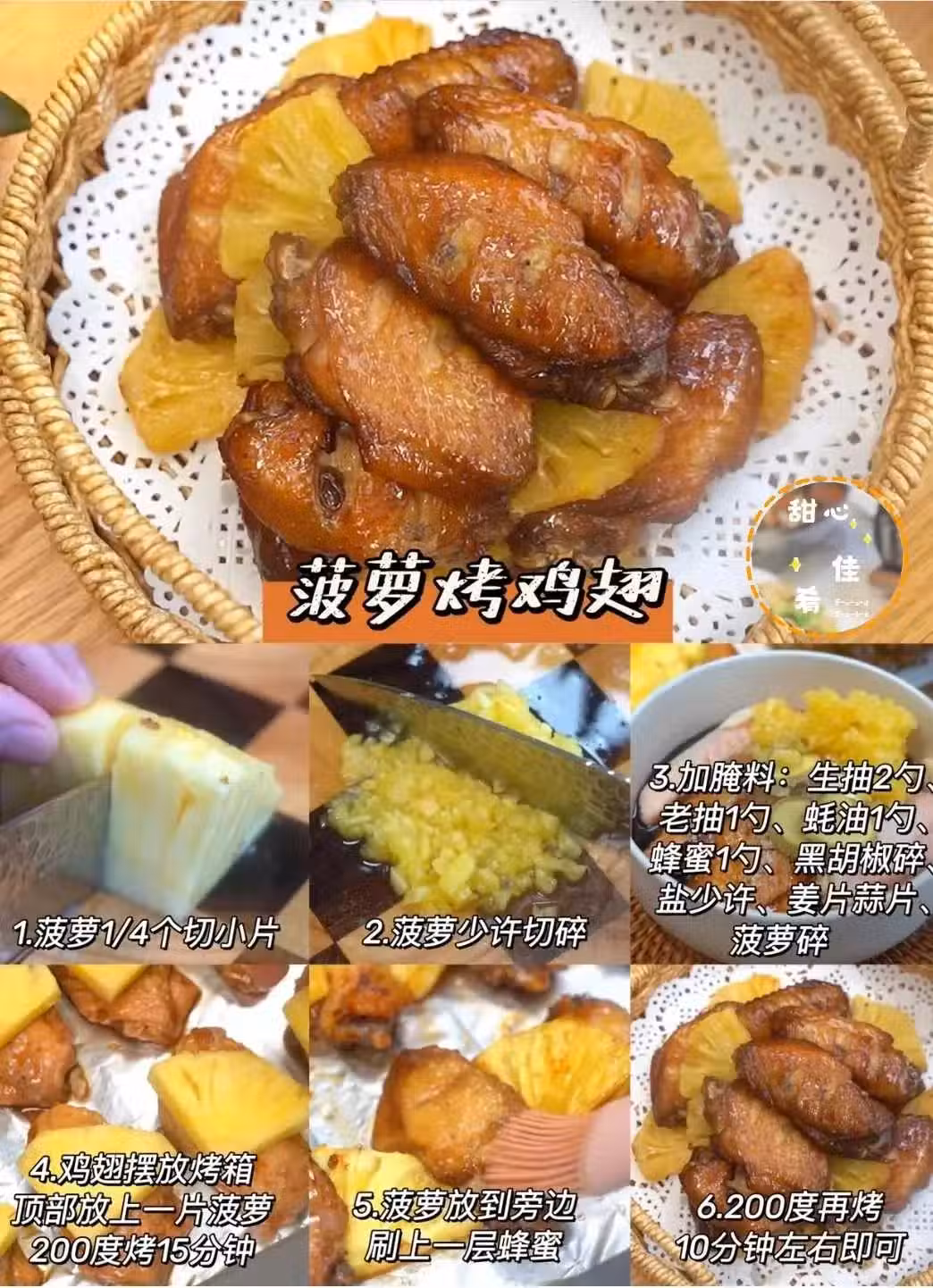🥣配方:雞翅10個、菠蘿半個、生抽2勺、老抽1勺、蚝油1勺、蜂蜜1勺、黑胡椒碎、鹽少許、薑片蒜片、菠蘿碎