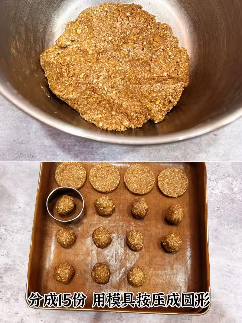🍃總重300克左右,分15份,每塊20克,我的模具直徑是6厘米的,沒有模具就直接用手按扁就行!