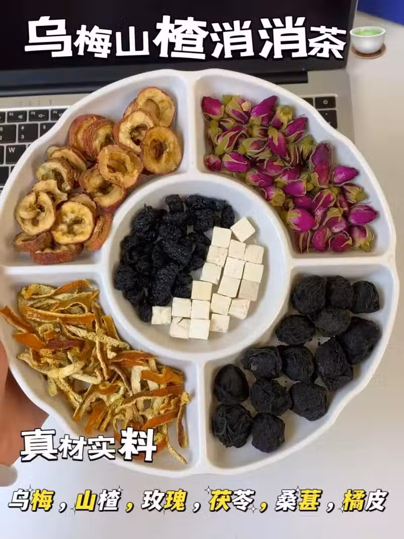 食材:烏梅的、山楂、黑桑葚、玫瑰、陳皮,茯苓