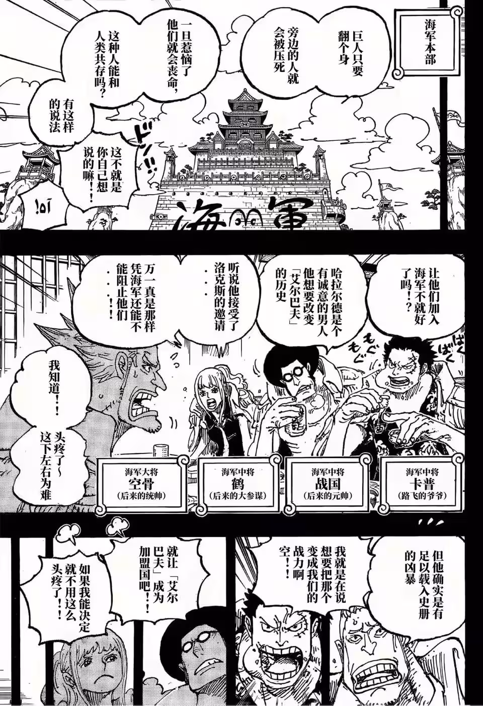 巨人加入海軍是無法接受了,很多海軍都不願意接納他們,畢竟巨人的身軀太大,一不小心就會壓死普通人。戰國,卡普,阿鶴中將等人正在跟鋼骨空討論這件事,他們認識巨人可以加入海軍,哈拉爾德國王要是被洛克斯挖走就麻煩了,鋼骨空說這件事必須要得到世界政府的准許。