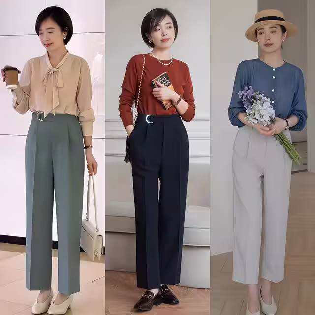 「上窄下寬」的梨形身材姐妹,很適合穿闊腿褲、煙管褲;腹部豐滿的蘋果型身材,可以通過錐形褲藏住贅肉;腰線明顯的沙漏型身材,穿修身西褲或九分褲,都能讓自己美得更出眾。