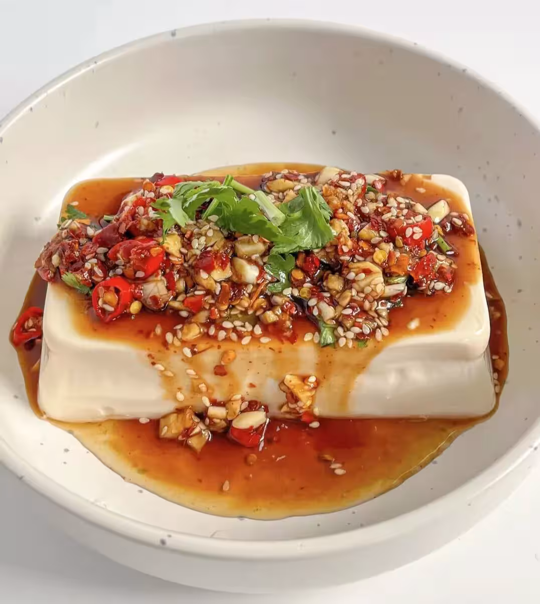 ①. 豆腐蒸熟放涼,置於白盤中央。