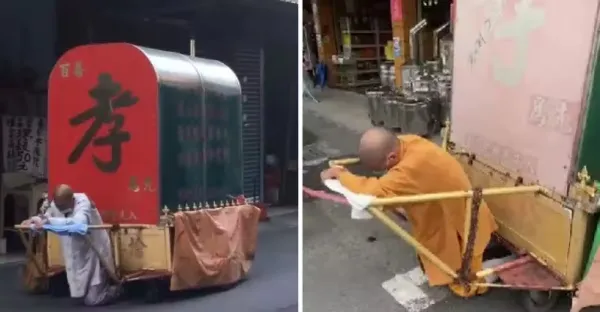 為亡父盡孝!屏東驚見苦行僧「拉棺材車跪行萬里」 希望警戒世人「懺悔23年準備休息」
